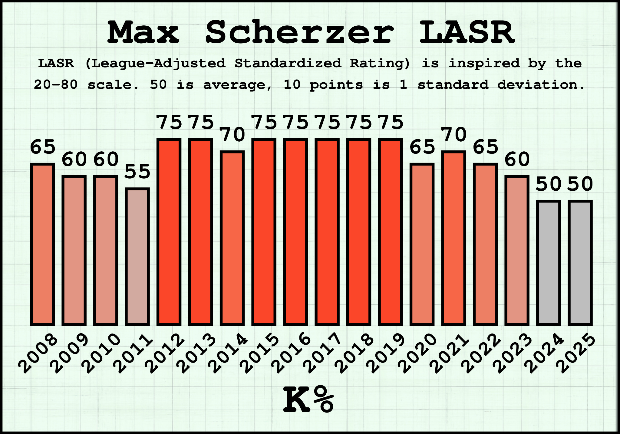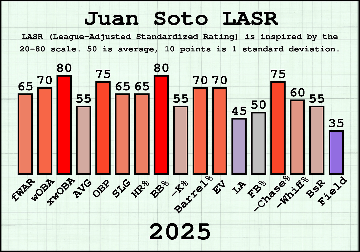 League-Adjusted Standardized Rating (LASR) is a project in which a wide range of baseball statistics are translated to the same scale, one modeled after the traditional 20-80 scouting scale. On the scale, 50 represents average and every 10 points above or below that is equal to 1 standard deviation. The project is designed to provide context to stats we may not have a comprehensive notion of quality for. It tells us exactly how impressive a .300 batting average is these days, whether a 15% whiff rate is desirable or not, the difference between a 3% home run rate (HR%) in 1915 and 2015, and much more.