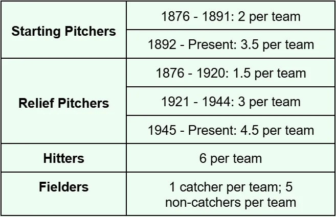 Establish a pool of “league regular” players for each season. These qualifier pools are composed of the top X players by playing time (Total Batters Faced (TBF) for pitchers, Plate Appearances (PA) for hitters, and Innings Played (Inn) for fielders), where X is a predetermined value multiplied by the number of teams in the league. These values for the AL/NL datasets are listed below. (Note: for Negro League data, I use 6 position players (for both hitting and fielding stats, since position and innings played data is incomplete) and 3 pitchers per team (the lines between SP and RP were quite blurry).) The reasoning for using this method is discussed in my article on the qualifier threshold.